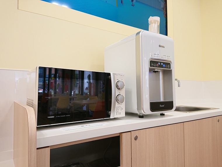 イートインスペースには、お子さま用の椅子や 抱っこの赤ちゃんも休めるソファー席、調乳器、離乳食を温める電子レンジもご用意しています。